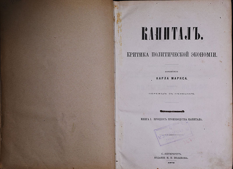 《资本论》第一卷俄文第一版。1872年,《资本论》第一卷俄文第一版出版,马克思曾赞誉该译本。这是《资本论》的第一个外文译本。