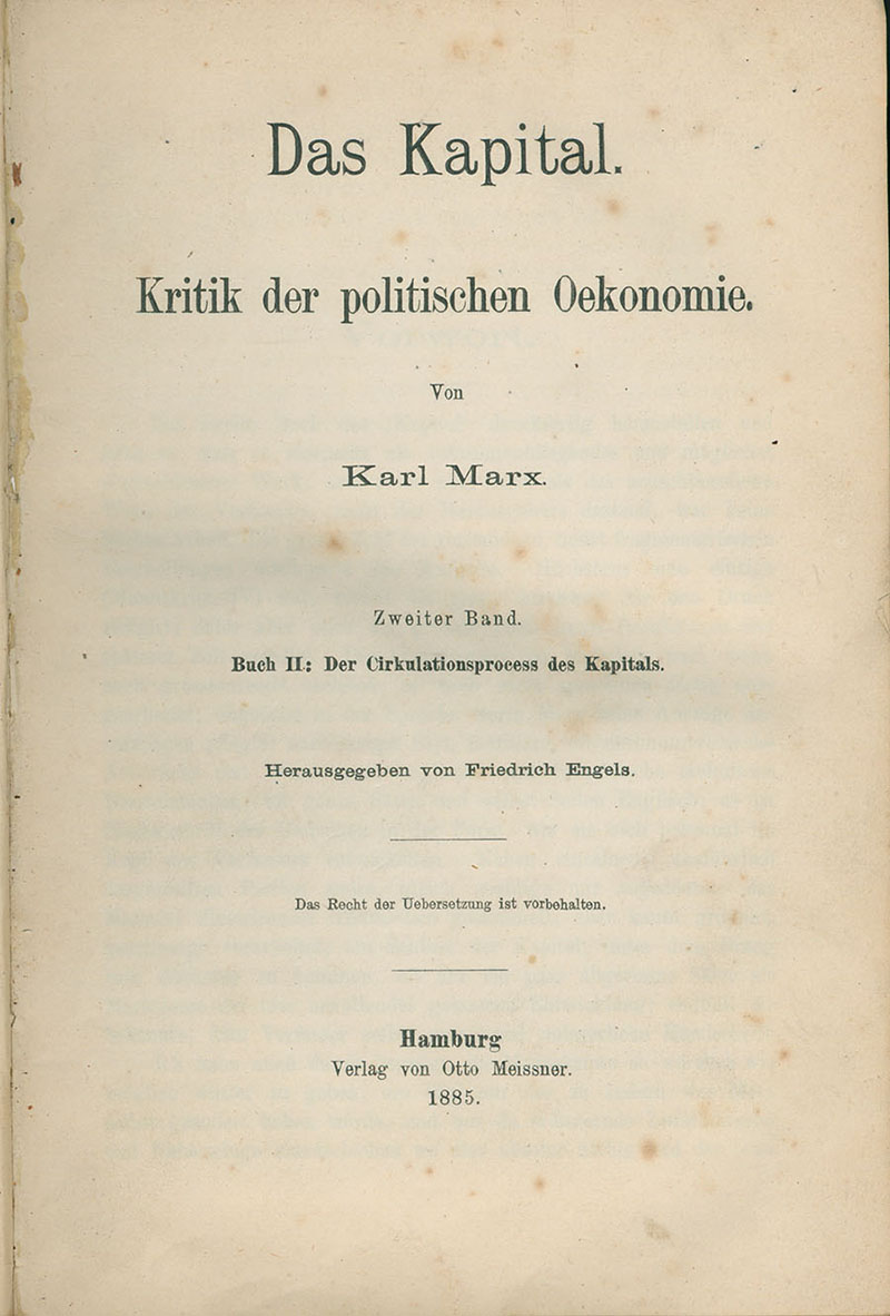 《资本论》第二卷德文第一版。1884论》第二卷年,恩格斯完成了《资本论》第二卷手稿的整理工作。属于第二卷的手稿很多,除个别比较完整的文稿外,多半带有片断性质。恩格斯倾注了大量心血,把这些手稿编辑整理成结构完整、论述缜密的著作,使《资本论》第二卷“成为一部只是作者的而不是编者的著作”。1885年7月,《资本论》第二卷出版。
