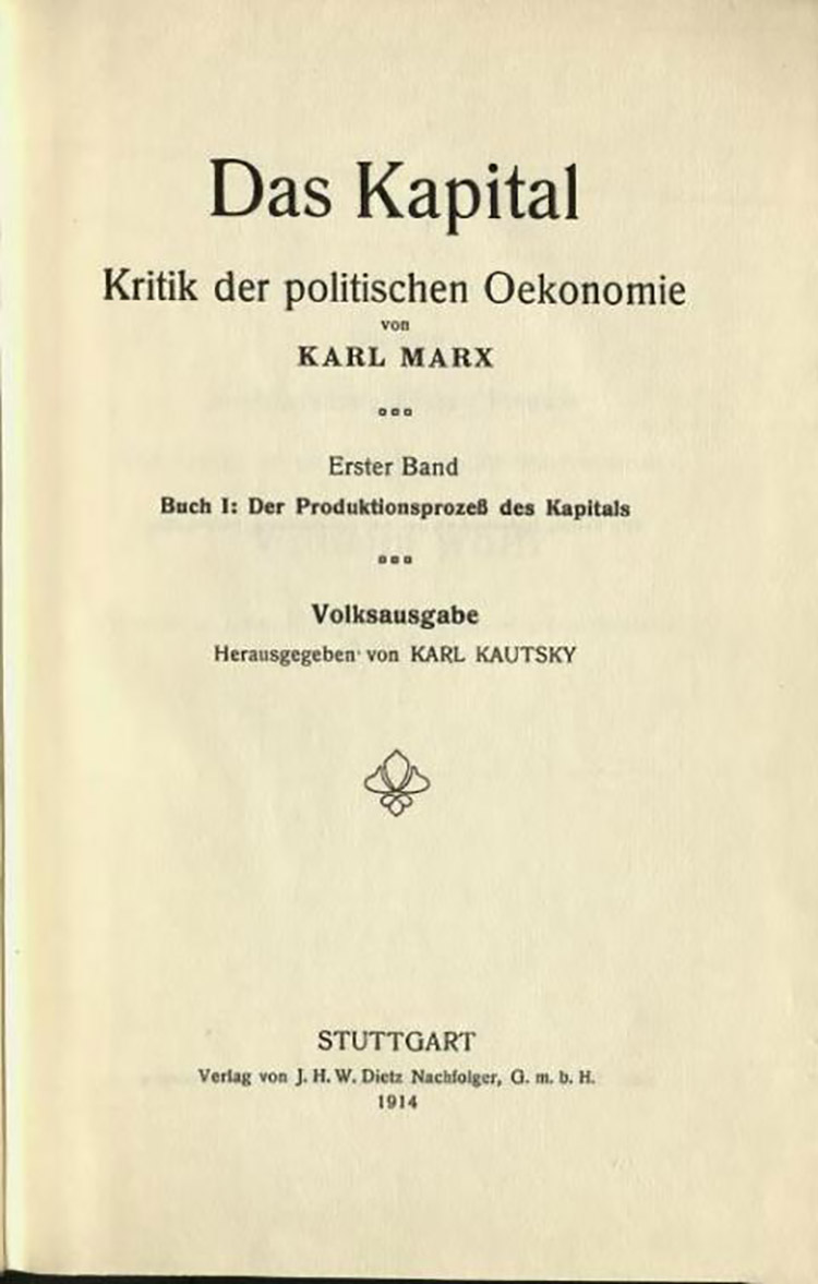 1914年出版的《资本论》第一卷普及版。在考茨基和梁赞诺夫的共同努力下,《资本论》第一卷普及版于1914年正式出版。该版本以马克思亲自修订过的《资本论》第一卷德文第二版为底本,同时参考了恩格斯在德文第三版和第四版以及法文版中所做的改动。此外,还核对了引文和出处,翻译了书中的外文表述,用德文替换了部分外来词。梁赞诺夫为普及版撰写了长达 80 页的索引。该版本不仅有利于普通工人读者更好地掌握《资本论》的思想精髓,同时也为整个《资本论》普及版的编辑工程开启了新篇章。