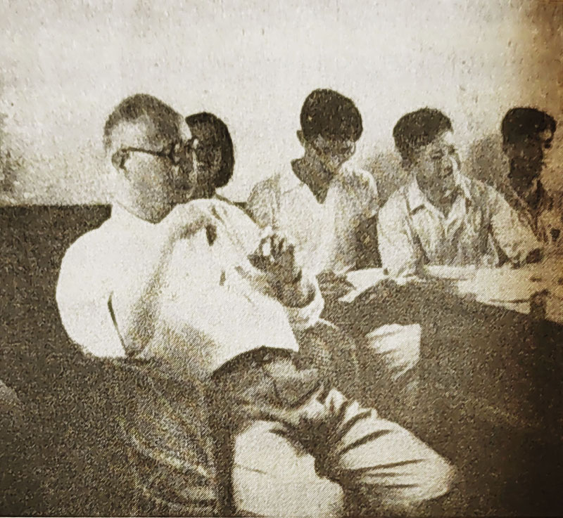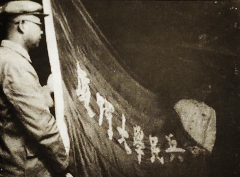 图为王亚南(左)在厦门大学民兵师成立大会上。