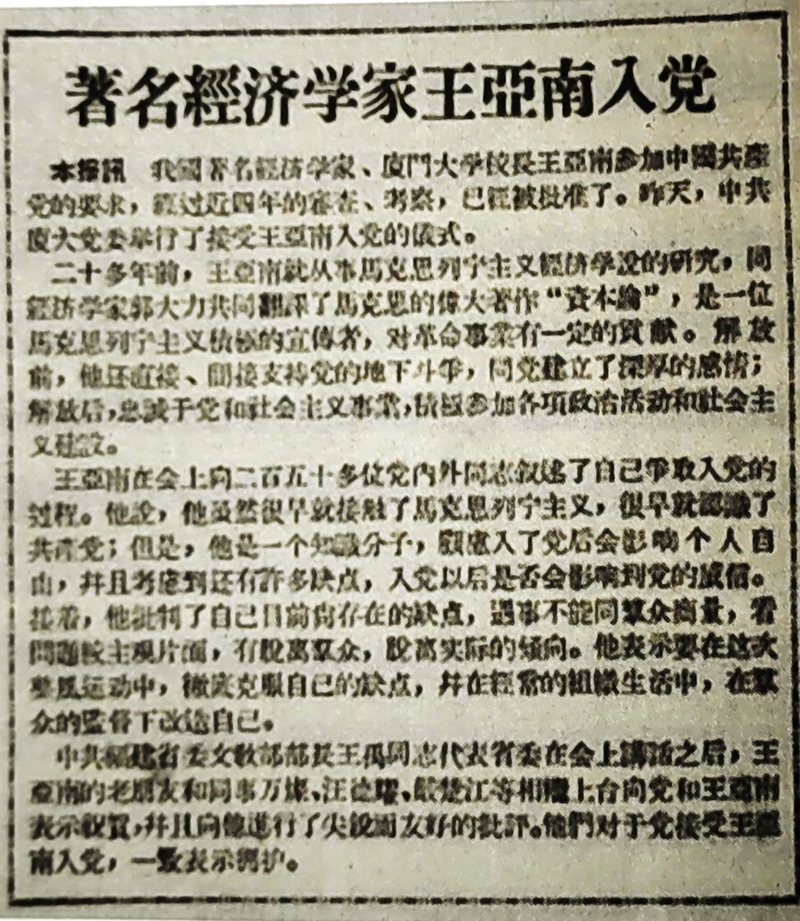 图为当时《厦门日报》关于王亚南入党的消息。